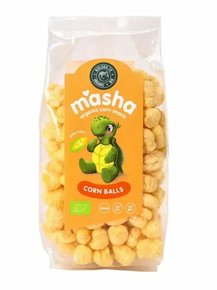 Кукурузные органические (сертифицировано по стандарту ЕС) шарики. В составе только органическая кукуруза. Кукурузные палочки без сахара, без соли. Веган.